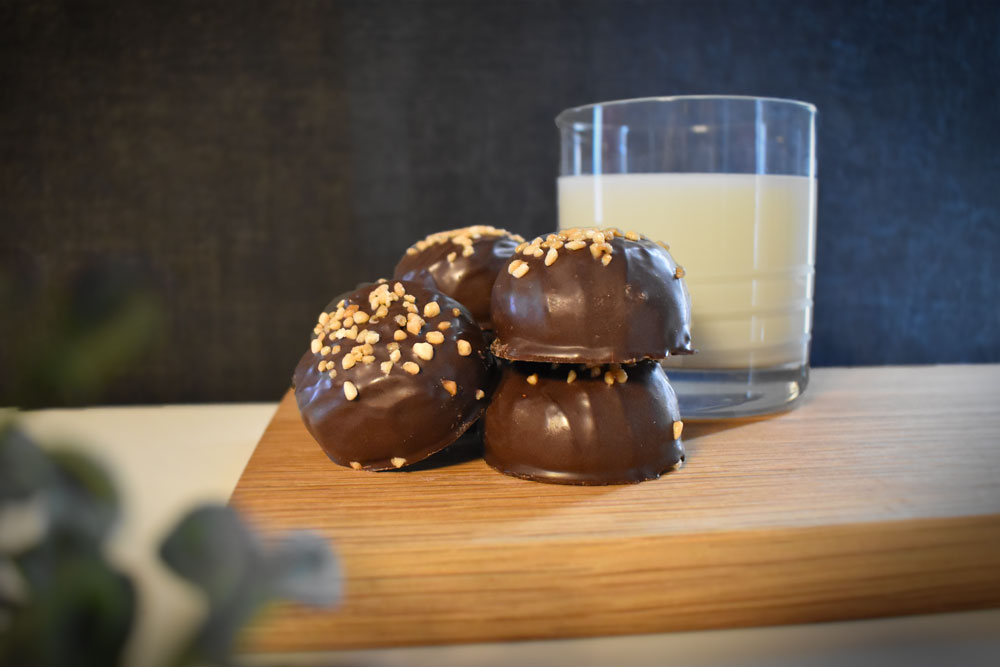 Geschmackvoll Arrakkugel bestehend aus Haferfüllung mit Arrakgeschmack, umgeben von Schokolade und belegt mit Schokoladenstreuseln.