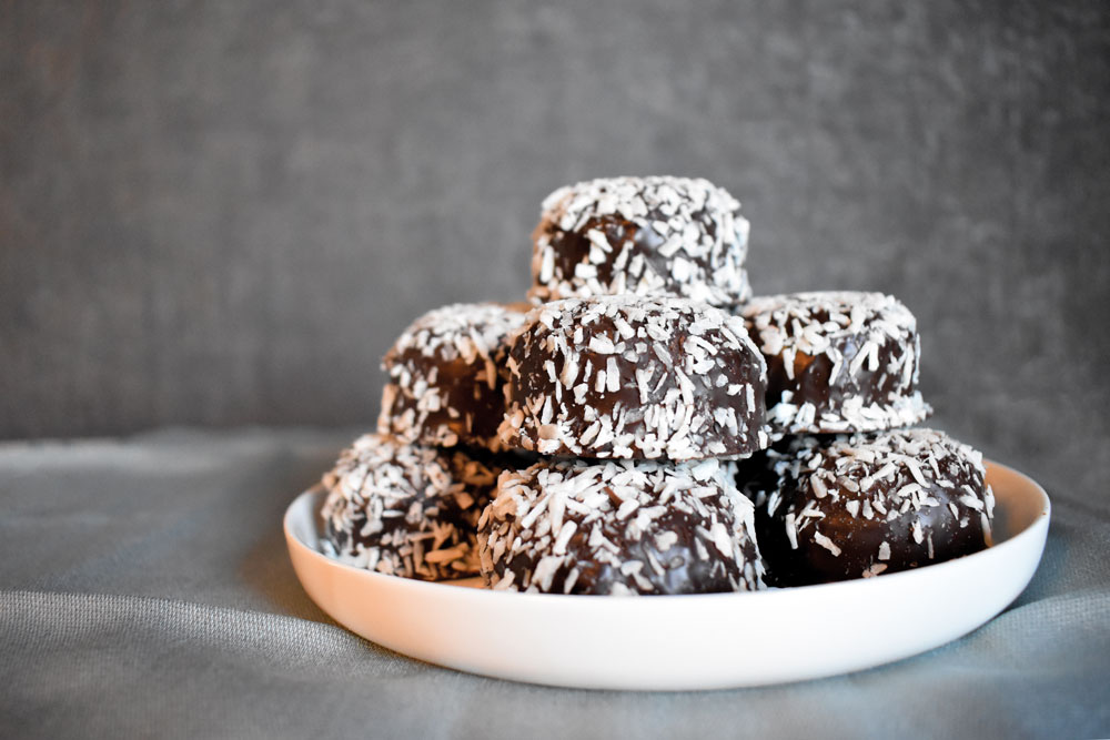 Traditionelle Schokoladenkugel mit Mokkageschmack, umgeben von Schokolade und bestreut mit Kokosnuss flocken.