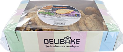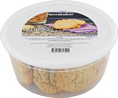 Havregryn 33 %, socker, vegetabilisk olja & fett (palm-, raps-, och kokos), vetemjöl, vatten, bakpulver (E500, E503), salt, emulgeringsmedel (E471 av vegetabiliskt fett), arom.