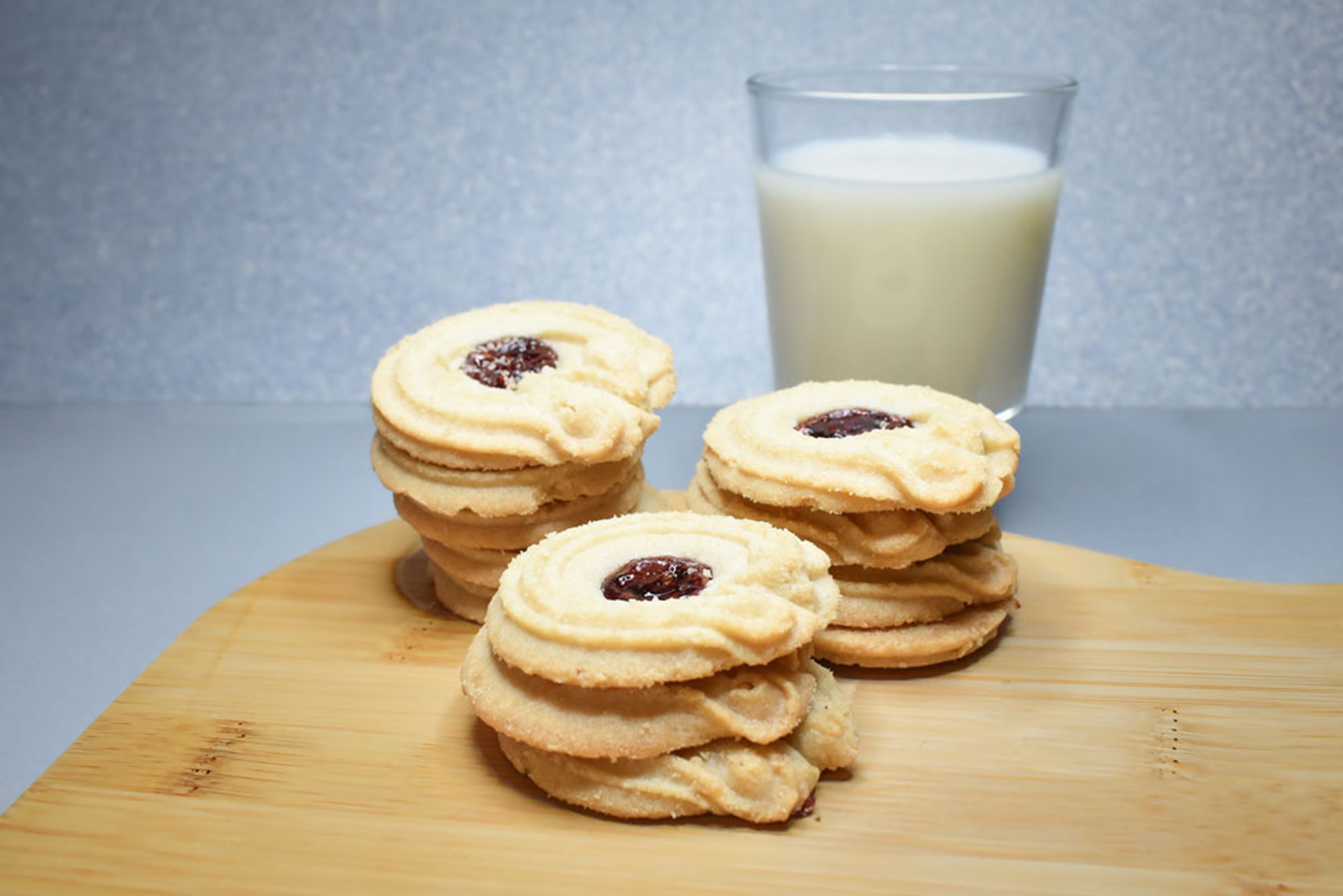 En spritsad spröd mördegskaka toppad med härlig hallonsylt.