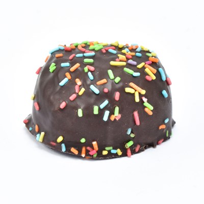 En boll med smak av kola och täckt av strössel i regnbågens färger